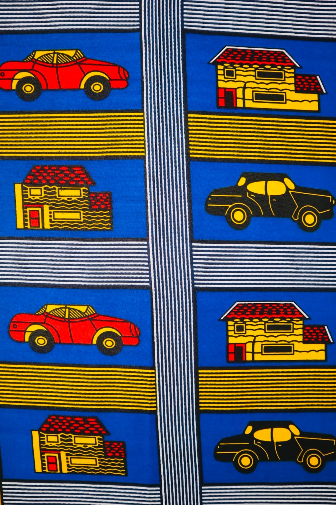 アフリカンワックスプリント布は、服はもちろん、頭に巻いたり、物を包むのにも使われて丈夫なためアフリカでは重宝されています。至るところで使用されていますが、もんぺは日本固有のパンツなのでアフリカには無いと思います。日本とアフリカ文化の融合がポッとするもんぺです。