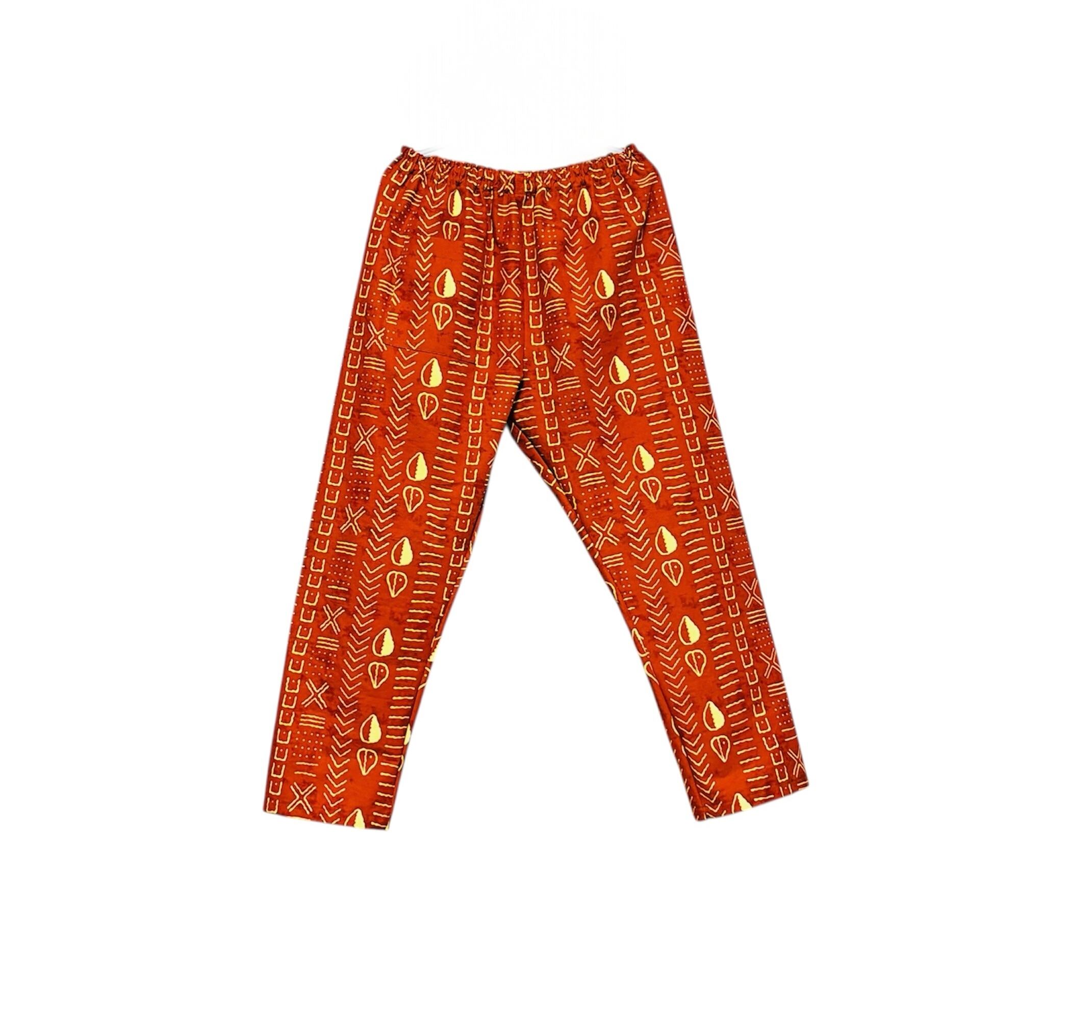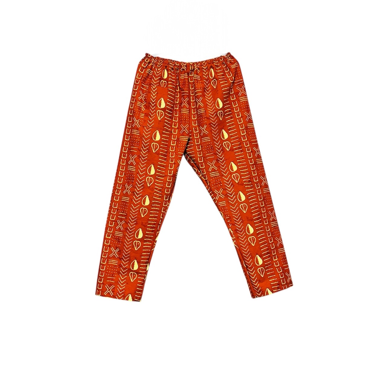 アフリカンワックスプリント布は、服はもちろん、頭に巻いたり、物を包むのにも使われて丈夫なためアフリカでは重宝されています。至るところで使用されていますが、もんぺは日本固有のパンツなのでアフリカには無いと思います。日本とアフリカ文化の融合がポッとするもんぺです。