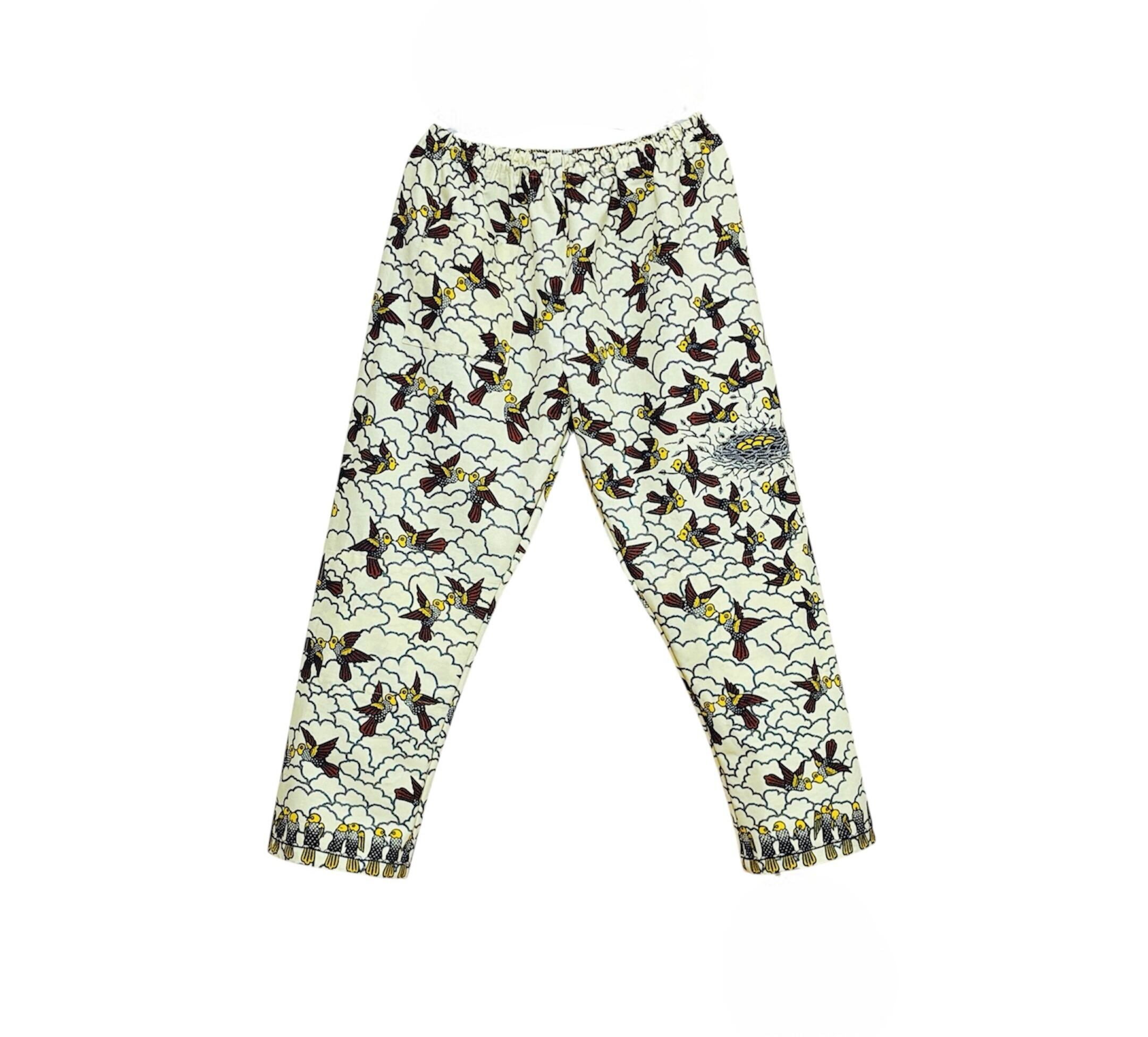 アフリカンワックスプリント布は、服はもちろん、頭に巻いたり、物を包むのにも使われて丈夫なためアフリカでは重宝されています。至るところで使用されていますが、もんぺは日本固有のパンツなのでアフリカには無いと思います。日本とアフリカ文化の融合がポッとするもんぺです。