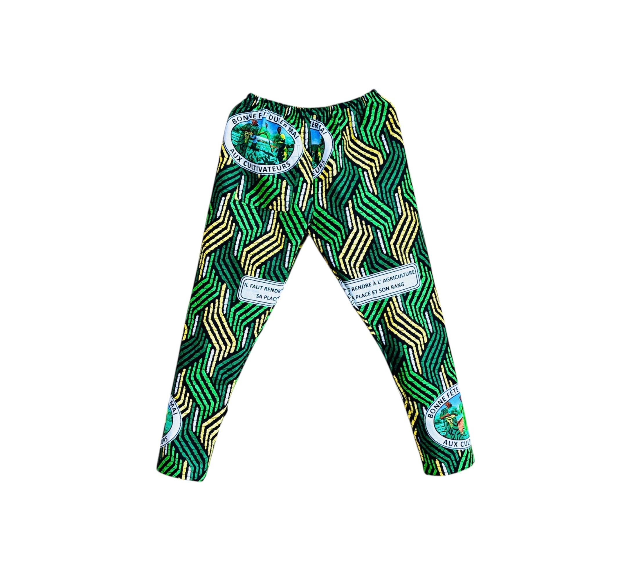 アフリカンワックスプリント布は、服はもちろん、頭に巻いたり、物を包むのにも使われて丈夫なためアフリカでは重宝されています。至るところで使用されていますが、もんぺは日本固有のパンツなのでアフリカには無いと思います。日本とアフリカ文化の融合がポッとするもんぺです。