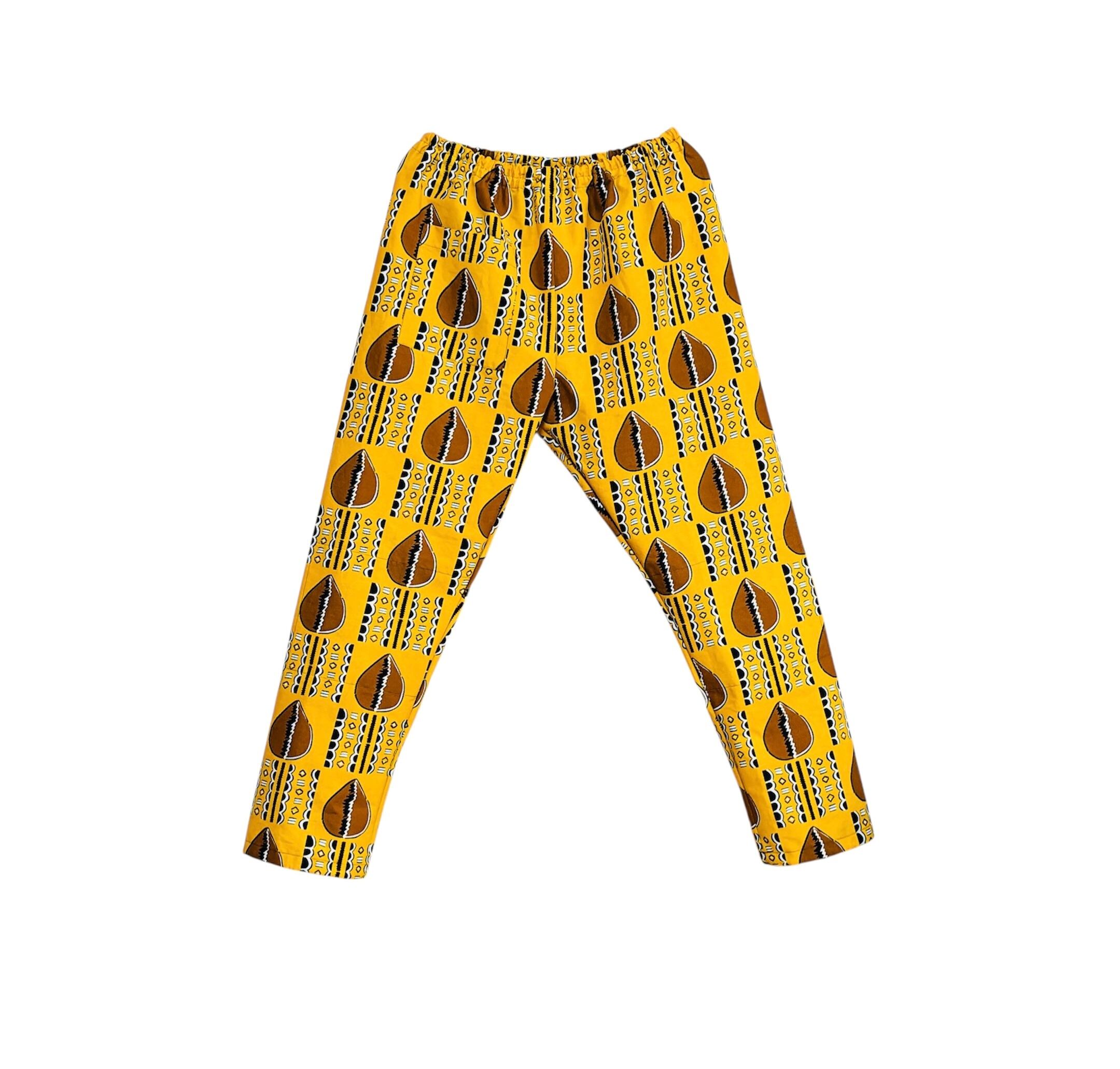 アフリカンワックスプリント布は、服はもちろん、頭に巻いたり、物を包むのにも使われて丈夫なためアフリカでは重宝されています。至るところで使用されていますが、もんぺは日本固有のパンツなのでアフリカには無いと思います。日本とアフリカ文化の融合がポッとするもんぺです。